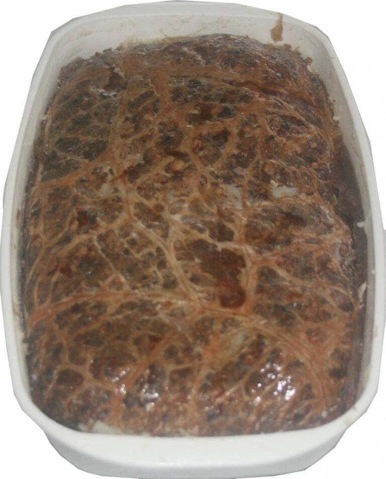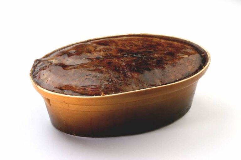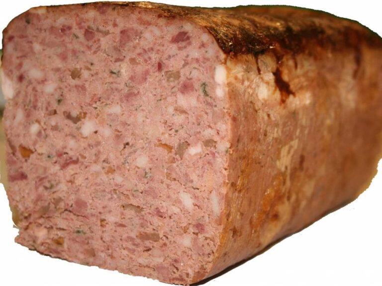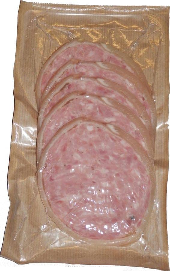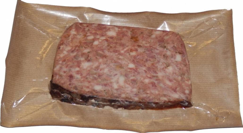 Il est fabriqué exclusivement à partir de viande et de foie de porc, toujours cuit au four, l’une de ses particularités étant l’échaudage des gras ou pochage. Recouverte de crépine, sa surface granuleuse est de couleur brune à noire.