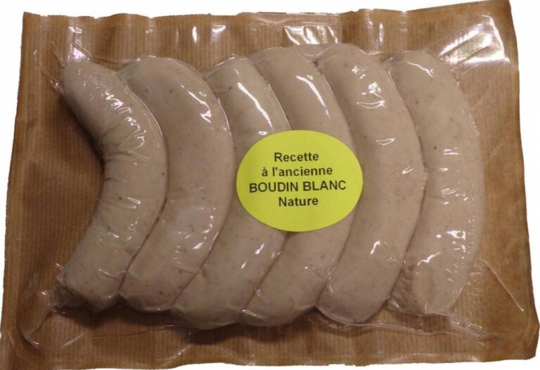 Le boudin blanc, préparation cuite de charcuterie fine, se présente sous forme d’une pâte très claire à base de viande blanche, maigre de porc, volaille ou veau et d’une enveloppe de menu de porc.