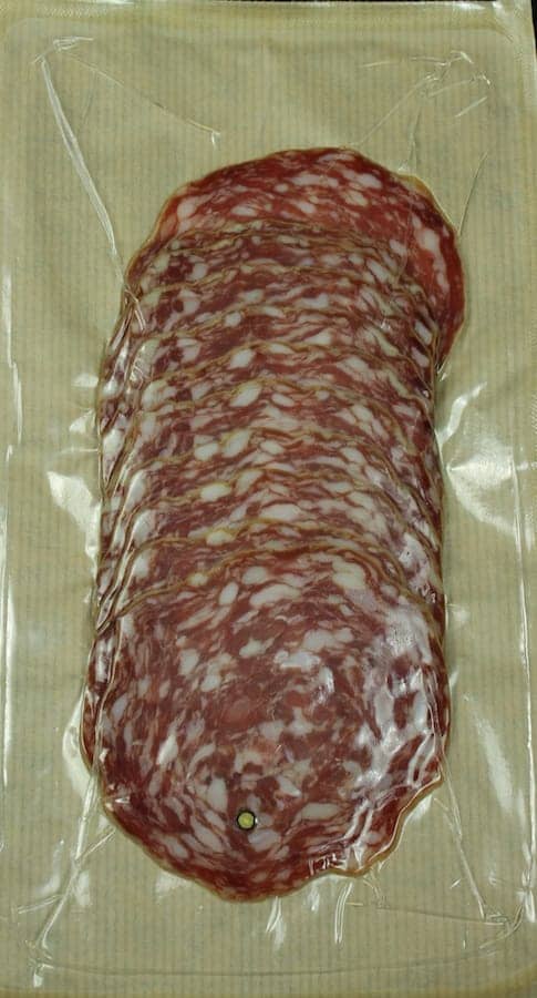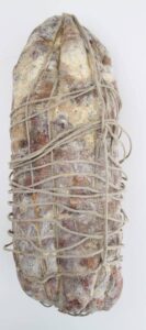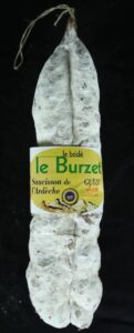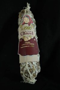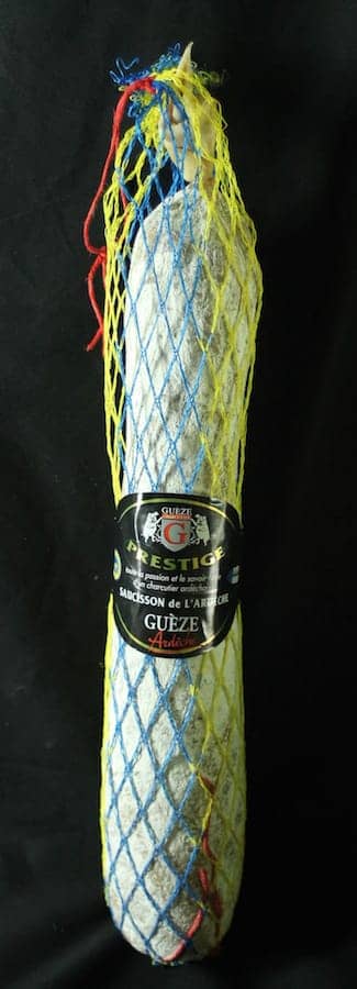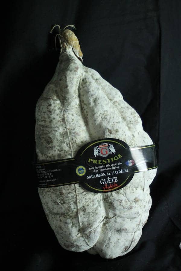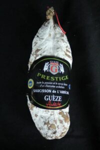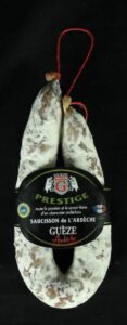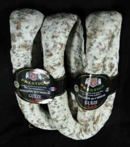 Chez Guèze, le saucisson est élaboré à partir de viande de porc rigoureusement sélectionnée, composée majoritairement de chair maigre, complétée par du gras dur. La viande est hachée à la grosse grille, salée, puis laissée au repos avant d’être embossée dans un boyau naturel de porc.